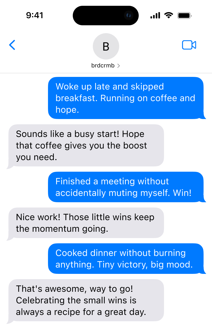 brdcrmb is a straightforward micro-journaling service: no need to dust off the notebook and write a masterpiece. Just send a quick text like you would to a friend, and brdcrmb organizes your thoughts, makes them searchable, and leverages our EmotionAI to offer insights and reflections.